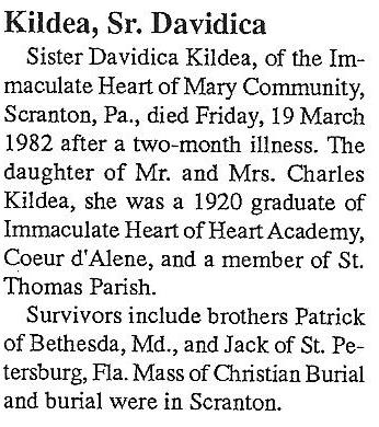 Sr Davidica, IHM — professed 15 Aug 1924, died 19 Mar 1982, buried in St Catherine Cemetery, Moscow PA. See obituary.