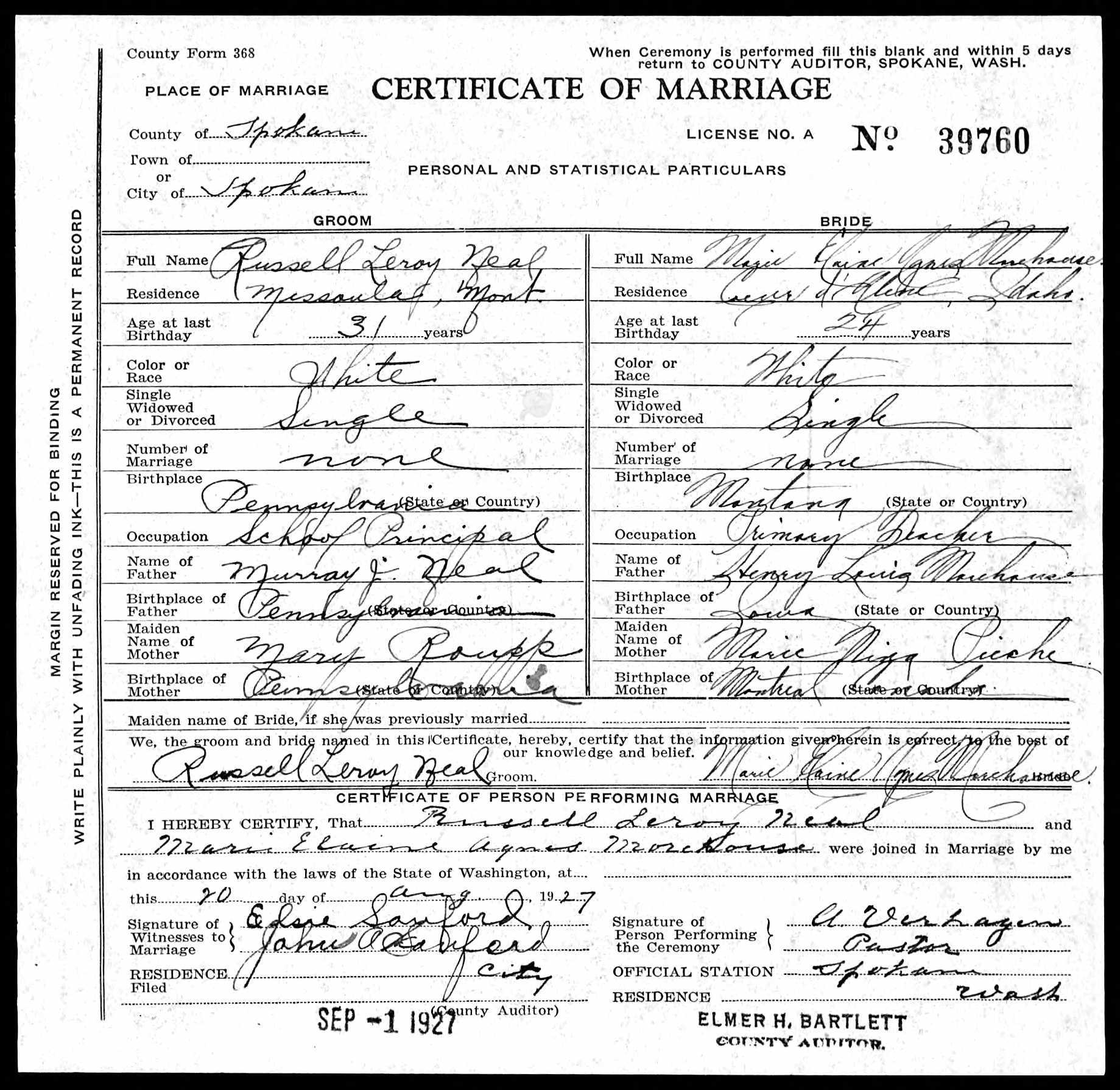 | MOREHOUSE | Marie Elaine Agnes | Born 18 Dec 1902 in Montana to Henry Louis & Marie Nina (PICCHE) MOREHOUSE. Became a teacher in Cd'A, then married 20 Aug 1927 at Spokane to Russell Leroy NEAL (1894-1991). They moved to Missoula, where she died 24 July 1990.