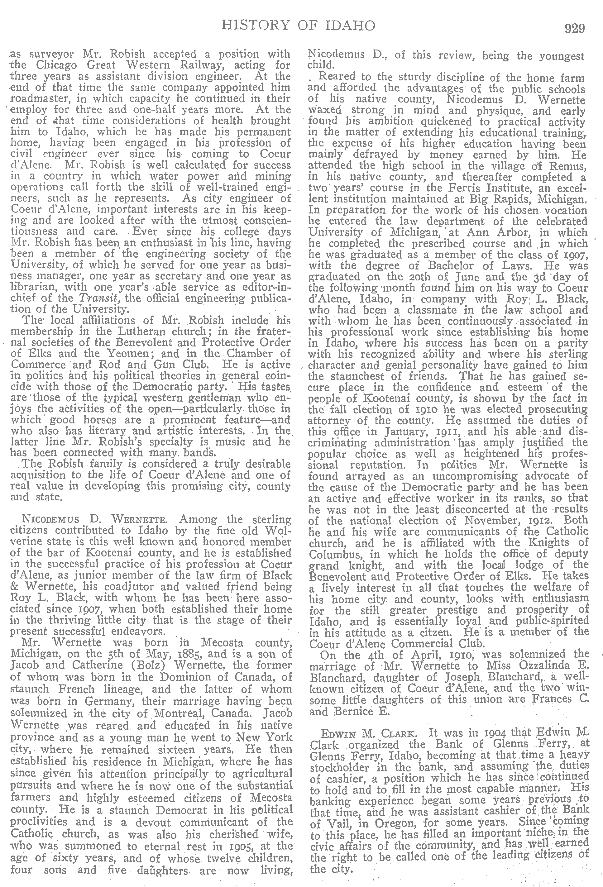 Nic graduated U Michigan (Ann Arbor) in 1907, and moved to Cd'A with Roy BLACK, a classmate and law partner. Nic married 4 Apr 1910 at Cd'A to Ozalinda Elizabeth BLANCHARD, daughter of Joseph BLANCHARD [possibly J BLANCHARD, b Jan 1833 French Canada, a widowed farmer in 1900 Frenchtown, Missoula MT, immig 1852, naturalized, owns farm (schedule 76), no mtge, no chn with him.