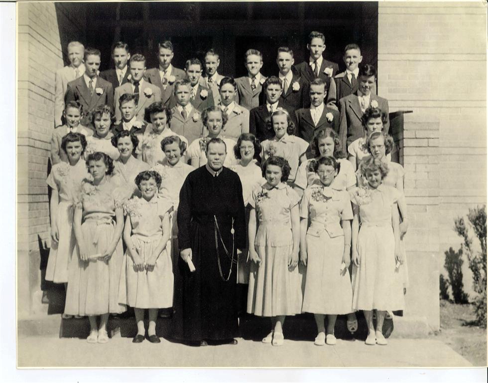 1950-1951 | 8th grade group photo | Eighth Grade graduates, on steps of St Thomas School. 33 students with Fr COLLINS, CSsR. | |
