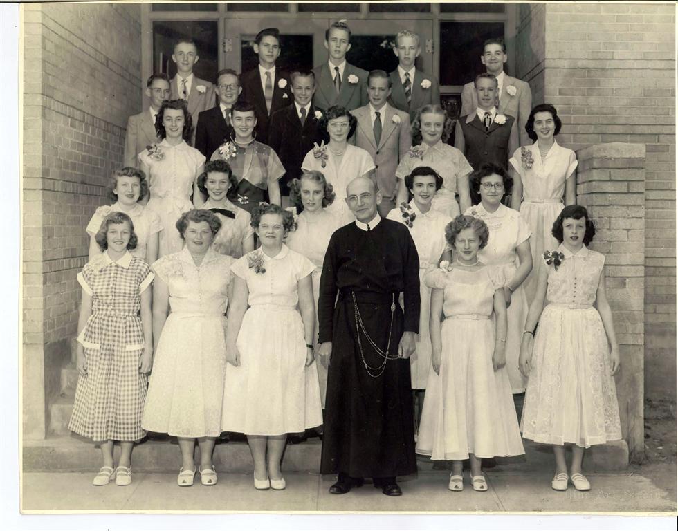 1952-1953 | 8th grade group photo | 25 students, Eighth Grade graduation, on steps of St Thomas School, with Fr MEIER, CSsR.