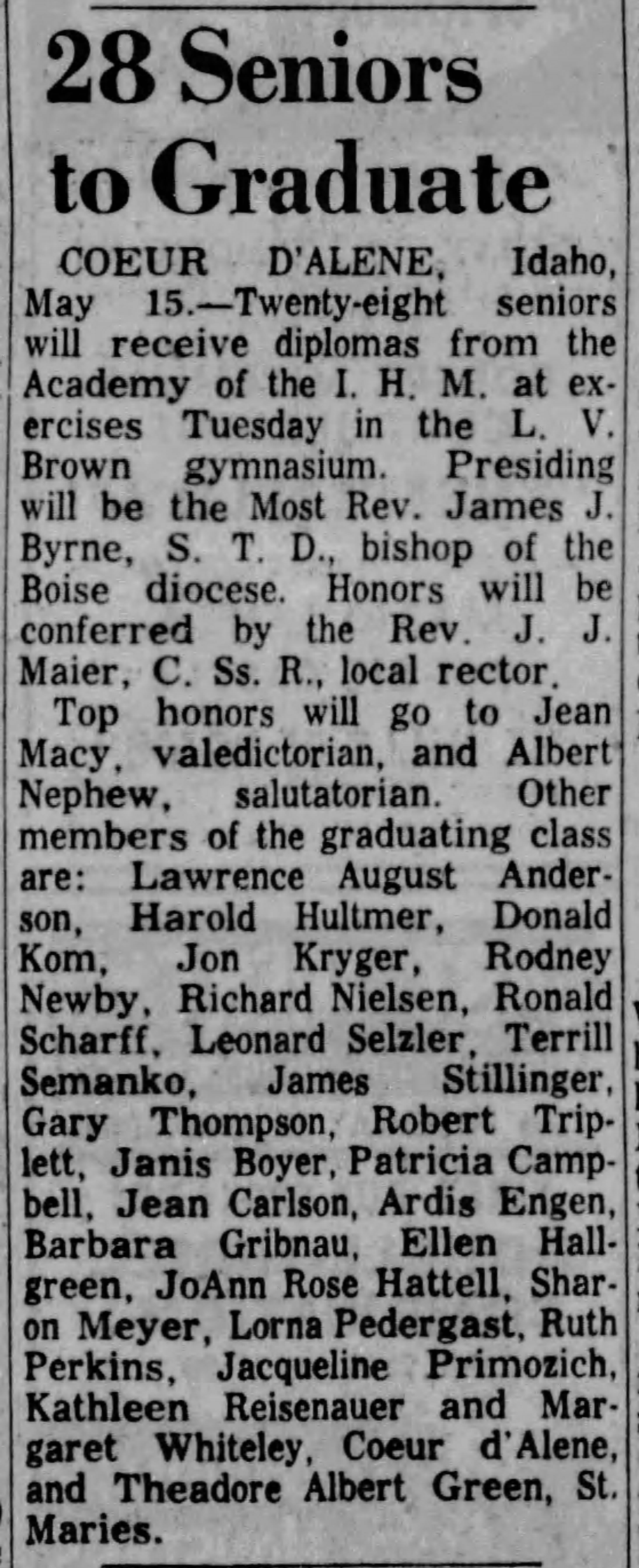 Alumni of IHM Academy, Coeur d'Alene, Idaho, class of 1958 | |||