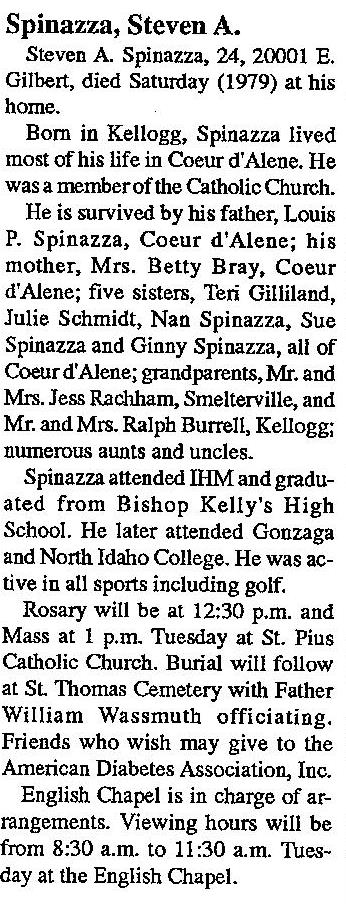 SPINAZZA | Steven A | Class representative 9; born 5 Sep 1955, died 8 Dec 1979, buried St Thomas cemetery. Photo of Steve. Brother of Terrine'70 and Julie'71 SPINAZZA. See obituary. |