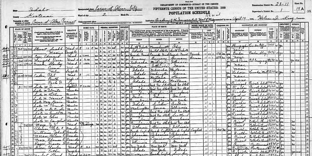 Priests and nuns in Coeur d'Alene, Idaho in the 1930 census